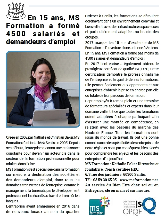 A l'occasion des 15 ans de MS Formation, un article est paru dans Senlis Ensemble, nous vous proposons d'en découvrir le contenu.